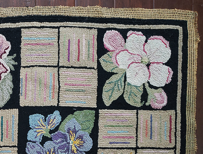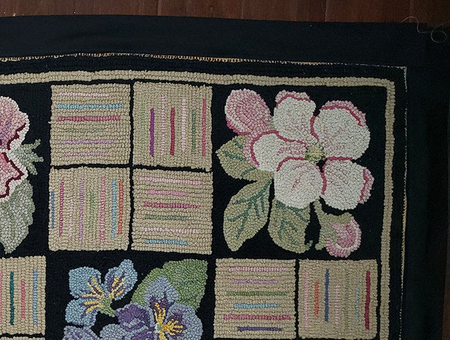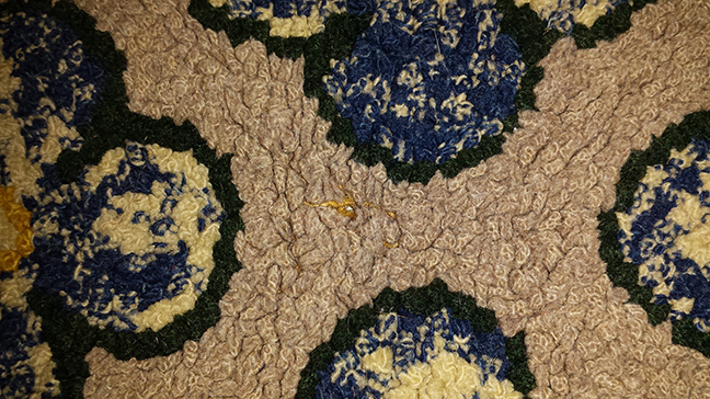 In addition to patching and rehooking a small hole in the lower right-hand corner, I also offered to bind the edge, but the owner declined, saying she intended to hang the rug in the future (more about that later).