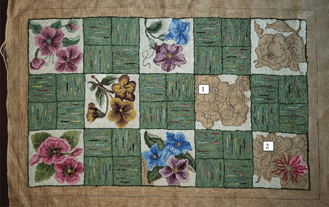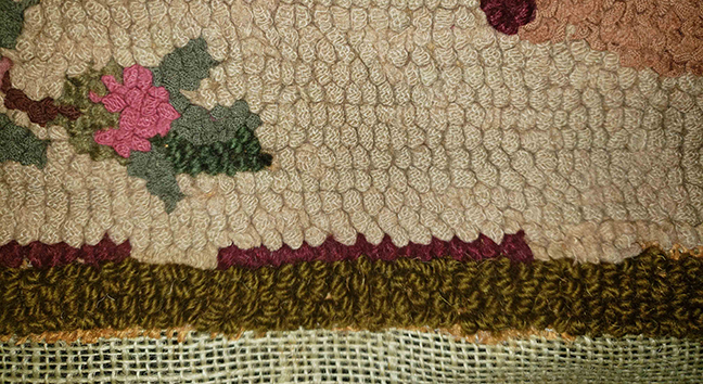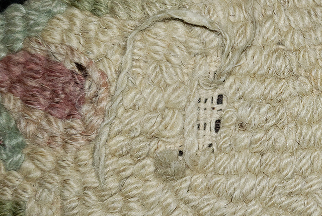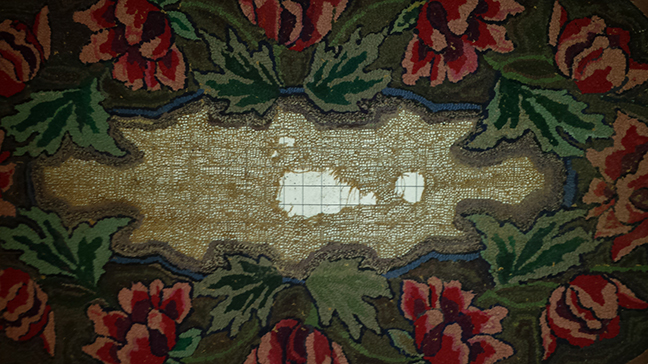 Sometimes an old hooked rug, otherwise in good condition, will show a hole, the work of a rat’s teeth or flying sparks or other accident. In mending such a rug, a knowledge of the technique of hooking is required. The worker applies a piece of burlap to the back of the rug, following the weave of the original foundation, which is usually parallel with the edges; this burlap is then sewed to the firm edges around the hole, and material exactly matching the surrounding color is hooked in (through both layers).