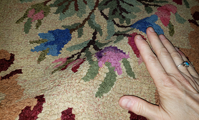 And the third option may be to rehook a whole section of a rug. I often suggest this option when I’m rehooking the outer border of a rug. Of all the work I do, rug hooking is the easiest and most fun, so if I can make a more perfect repair that way, I will offer that remedy.