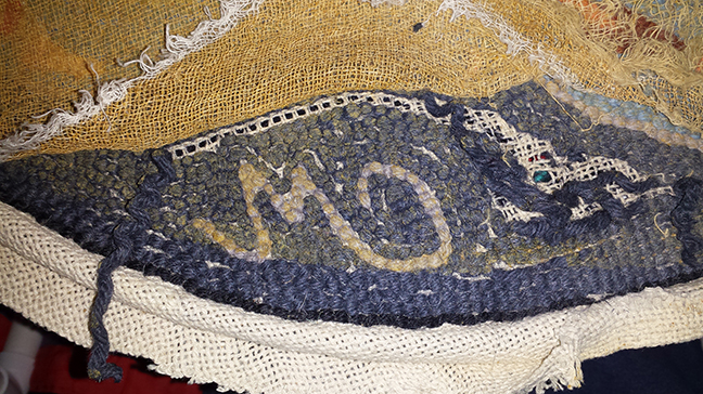 Here’s the rug from the top (above), unhooked, the original backing sewn down to the patch.