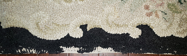 There was a wool braid which had been sewn all along the top of the rug to cover the broken burlap along the foldline. Once removed (above), the state of the edge was clear. As with any damage to the backing, I unhooked until I found healthy backing, sewed in a patch, and rehooked through both layers.