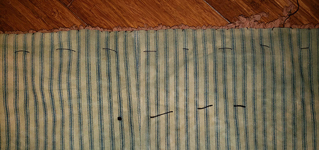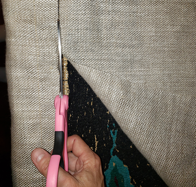 The first step was to lay the rug face down, and pin the linen yardage to the back. Then, with a sharpie pen, I marked the line where I would cut out the middle of the yardage (above).