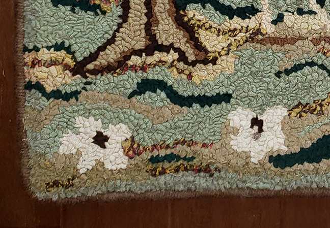 I’m not always able to rehook with the original strips, but in this case, the rayon dress material found in the border was quite durable, so I didn’t have to come up with yarn to match it’s unique appearance. Rayon was invented around 1910, creating durable threads from wood pulp, of all things, which became the iconic dress material of the 1930s and beyond. It was durable and practical, with that wonderful drape we associate with dress-making of the period. The silk stockings, hooked into the maple and the evergreen trees in the background, show the skill of this intepid rug hooker, undaunted by her lack of raw materials. She created beauty with what she had available, bless her creative heart.