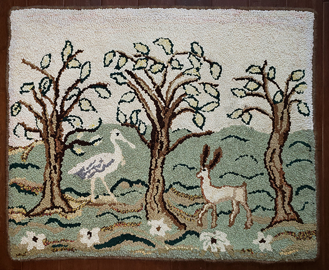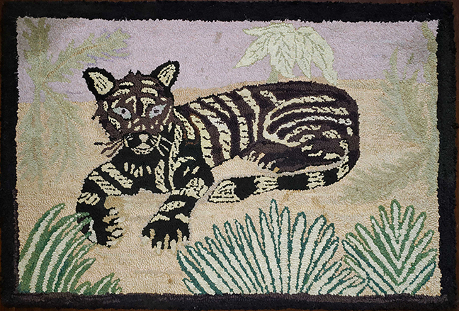 This rug was probably hooked in the 1940’s. The design comes right out of the popular culture of the day. There was a great fascination with exotic locations, jungles, tropical islands and such. But also because of the unusual material that it was hooked with, rayon dress material, which makes sense. During the war, people were encouraged to reuse and recycle. If new wool couldn’t be found, they would hook with what they had.
