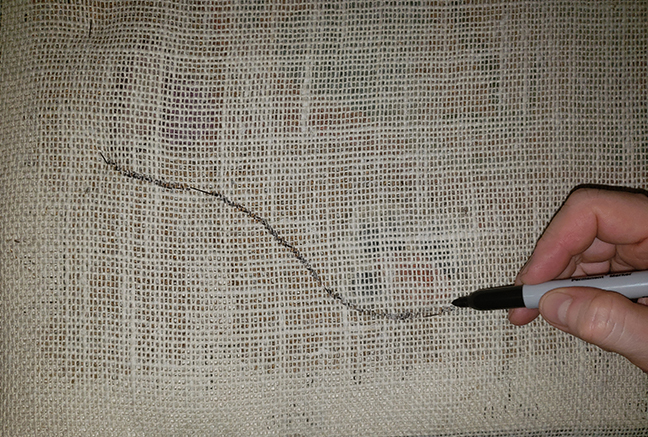 Since the rug was originally hooked on burlap, I used that for the patch. With the rug lying face down, I pinned the new burlap in place, then drew a line with a sharpie pen where the pins were.