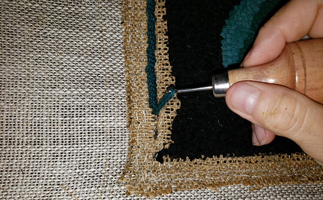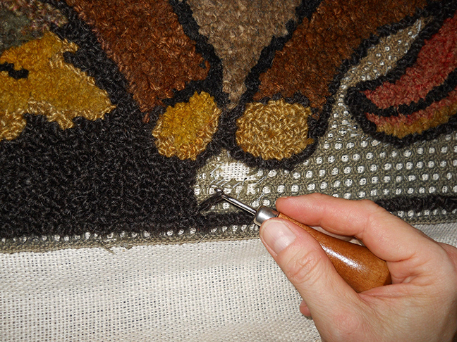 For the Donovan rug, there was the normal fraying along the edge. I unhooked the border and unsewed the hem, then I sewed in a new reinforced patch. Here you see me beginning to hook a new border through both layers to match the border in the center section of the rug (below).
