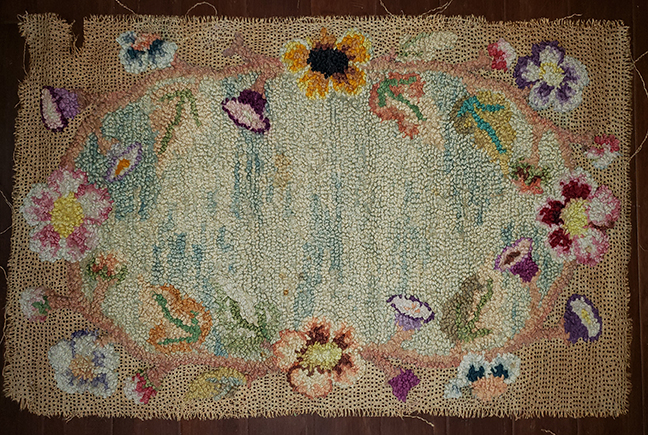Lillian after, 27”x45.” Wool fabric strips and wool yarn on burlap. Center section patched and rehooked.