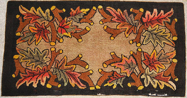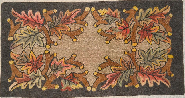 Autumn Leaves after, 32”x50.” Wool strips and yarn on burlap. Border patched and rehooked, edge bound and hemmed.