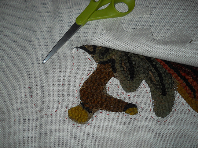 Because I wanted to get in as much of the background as I could into the patch, I tacked the burlap to the unhooked background area, and cut the center section out (above). Then I carefully zig-zagged the raw edges of the burlap so it wouldn’t unravel during the hooking process.