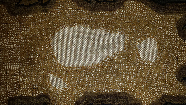 Lillian before, 27”x45.” Wool fabric strips and yarn on burlap.