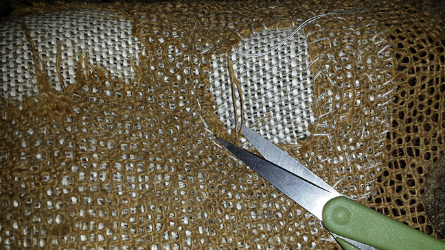 The first step was to unhook the burlap patch in the back, then I unsewed the burlap patch.