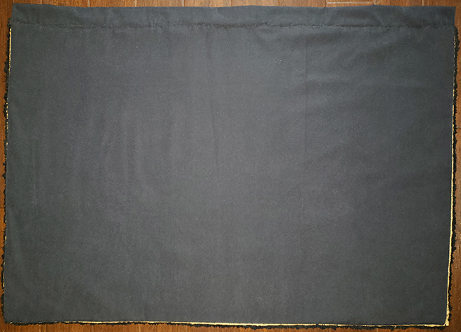 I sewed a plain black material over the back of the rug to cover the hem tape. You can see that I left extra hem tape on the top. I sewed that into the black material, so the hem tape is taking all the weight around the casing for the rod.