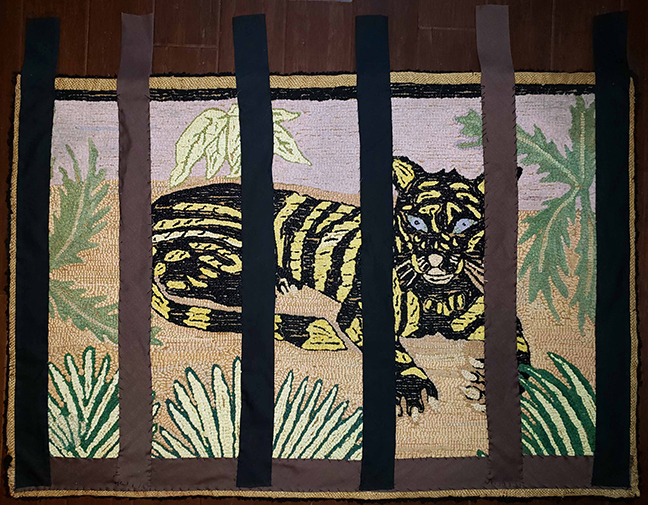 Tiger after, 36”x24.” Rayon strips on burlap. Patched and reinforced for hanging on the wall.