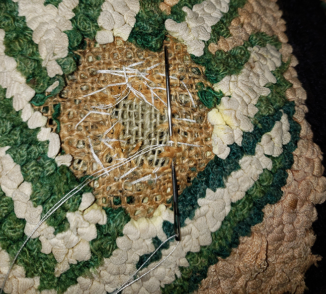 We were lucky that the break in the burlap was limited to the foldline in this case. Often it spreads farther into hooked area. So I could either sew in a patch, and hem it to the original size, or I could reduce the size a little bit, and bind the edge over the healthy burlap. That was how I approached this fix.