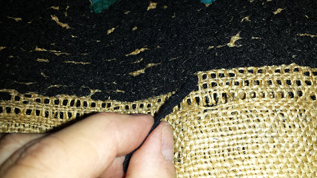 Here you see a close-up the border unhooked, and the new burlap sewn in.