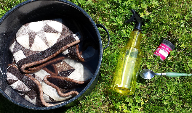 I mixed dye in the spray bottle, and slowly sprayed the rug, top and bottom. I wanted to try to get the dye spread out evenly all over the rug. Once I had applied enough dye, I filled up my dyepot with clean cold water, and gently dropped the dye-soaked rug in the pot.
