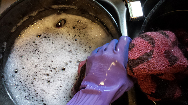 I fill another enamel pot with the hottest tap water I can get. After I have filled the pot, I add a splash of dishwashing liquid. Add the soap after you have filled the pot because you don’t want too many suds.