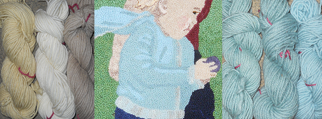 Wool can be blended in the spinning process to create subtle shading. In the picture above, you see the unspun wool on top, and all the different shades I got by blending those colors to hook the skin tones in the portrait below.