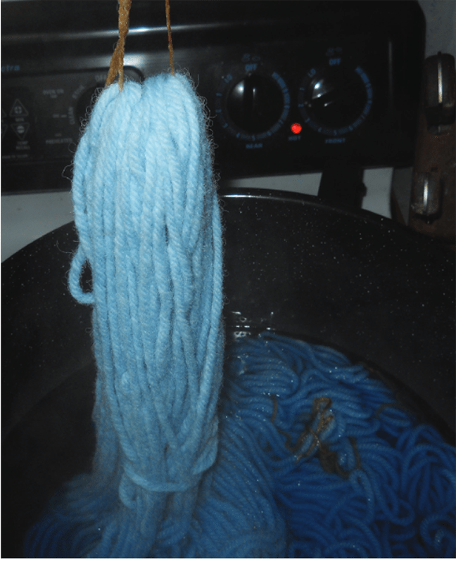 Fill your dyepot with cold water (enough that your yarn will have plenty of room to move around). Cover it and bring it to a boil. I usually start with less dye than I think I will need (it’s easier to add more dye than to take it away). Then I put a small piece of yarn into the dye for a couple of minutes. If it’s too pale, I add a little more dye and test again. When I’m satisfied with the color in the pot, I lower my cross-tied skeins into the dyebath. Go slow, and gently push them down until all the yarn is covered (below).