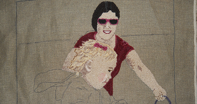 Block Party Rug, 23.5”x30.” Natural colored wool yarn on linen, overdyed.