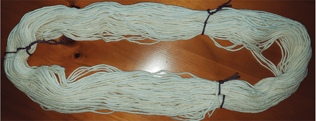 Cross-tie your skeins at least three times, with a figure 8 wrap. I use acrylic yarn for the cross-ties, because it won’t absorb any dye, so it’s easy to find them to lift the skeins.