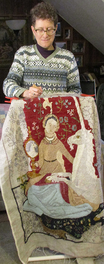 Miranda, 23”x29.” Handspun yarn in natural colors on linen. Designed and hooked by Judy Taylor.