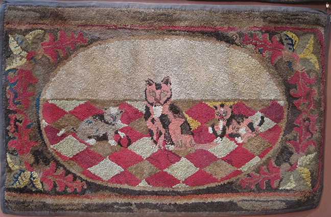 Cat With Kittens, 61”x32,” wool yarn. Courtesy of Linda Rosen Antiques. Notice the edge is bound with fabric, very helpful for its survival.