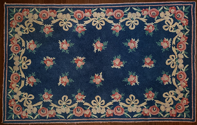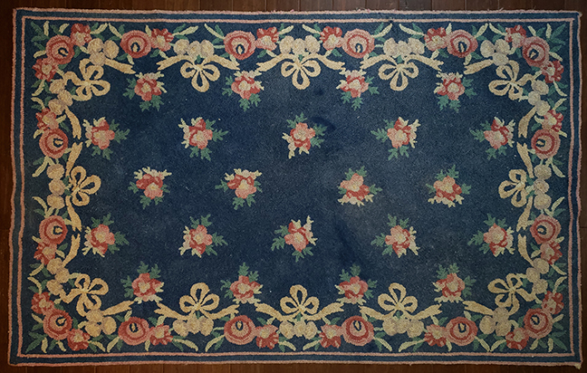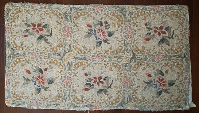 Josephine, 27”x40.5.” A charming old rug hooked with silk and cotton stockings. I love how the hooker just kept going. When she ran out of one stocking, she continued with whatever she could get her hands on!