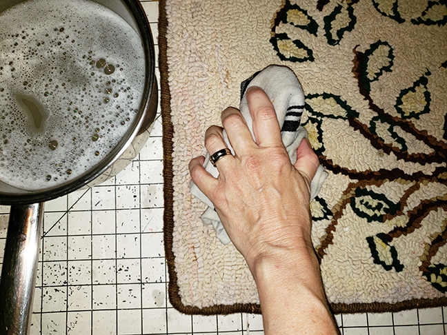 Dipping a clean rag in the soapy pan, squeeze the rag almost all the way out. Remember, you don’t need to get the rug soaking wet, just enough moisture to remove the dust, hair and grit that clings to the surface. I press the rag down on the rug and pivot, gently scrubbing the surface, one small area at a time.