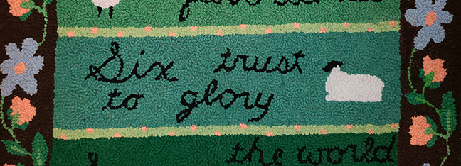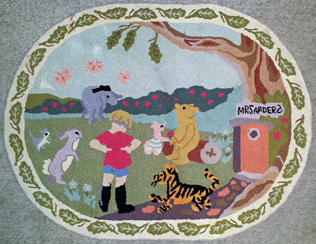 In this Winnie the Pooh rug, there was a light stain by the leaves on the tree, and a small amount unhooked by the left butterfly. In order to hide the repairs, I just added a few clouds to the sky area. Then I bound the edge to protect it for the future.