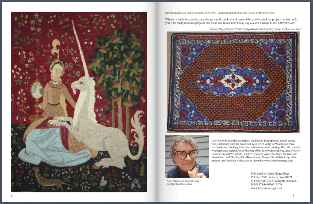 This book is a good one for anyone interested in hooking with yarn. It’s full of easy, yet interesting text, pictures and projects for anyone who wants to learn how to hook or wants to further their skills. Judy Taylor is a bright, talented person, who knows all aspects of hooking very well. She explains every aspect of this craft well, and she is a very creative artist with many of her own rugs in the book. She is the reason I have learned to hook with yarn, and I love it. This book is a must-have for any rug hooker’s shelf! (Kerry M.)